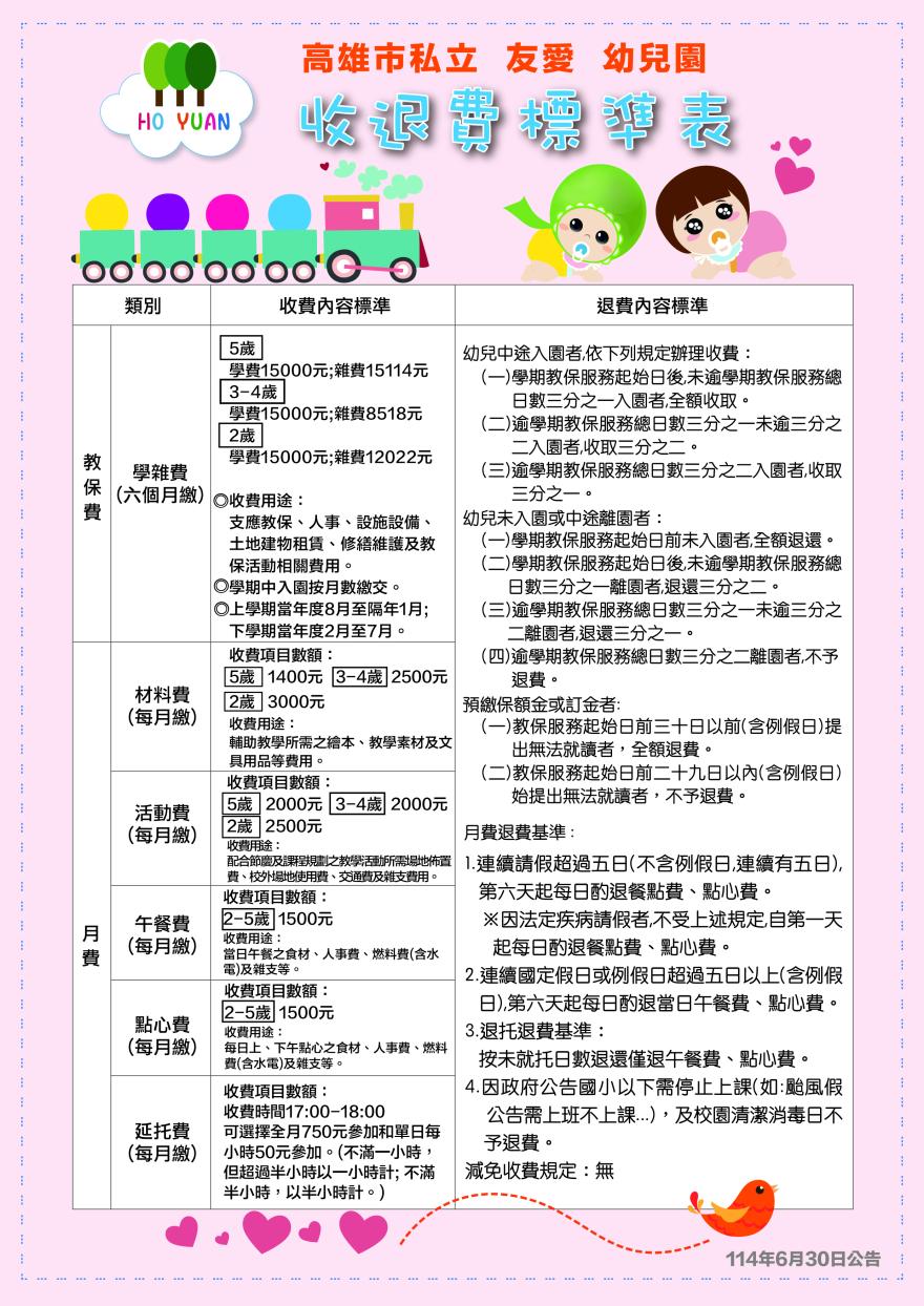 高雄市私立友愛幼兒園114學年度收退費標準表
