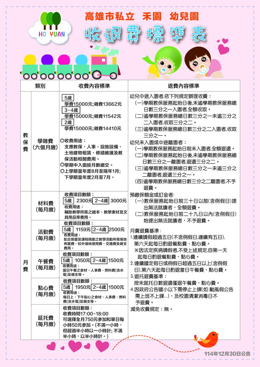 高雄市私立禾園幼兒園114學年度收退費標準表