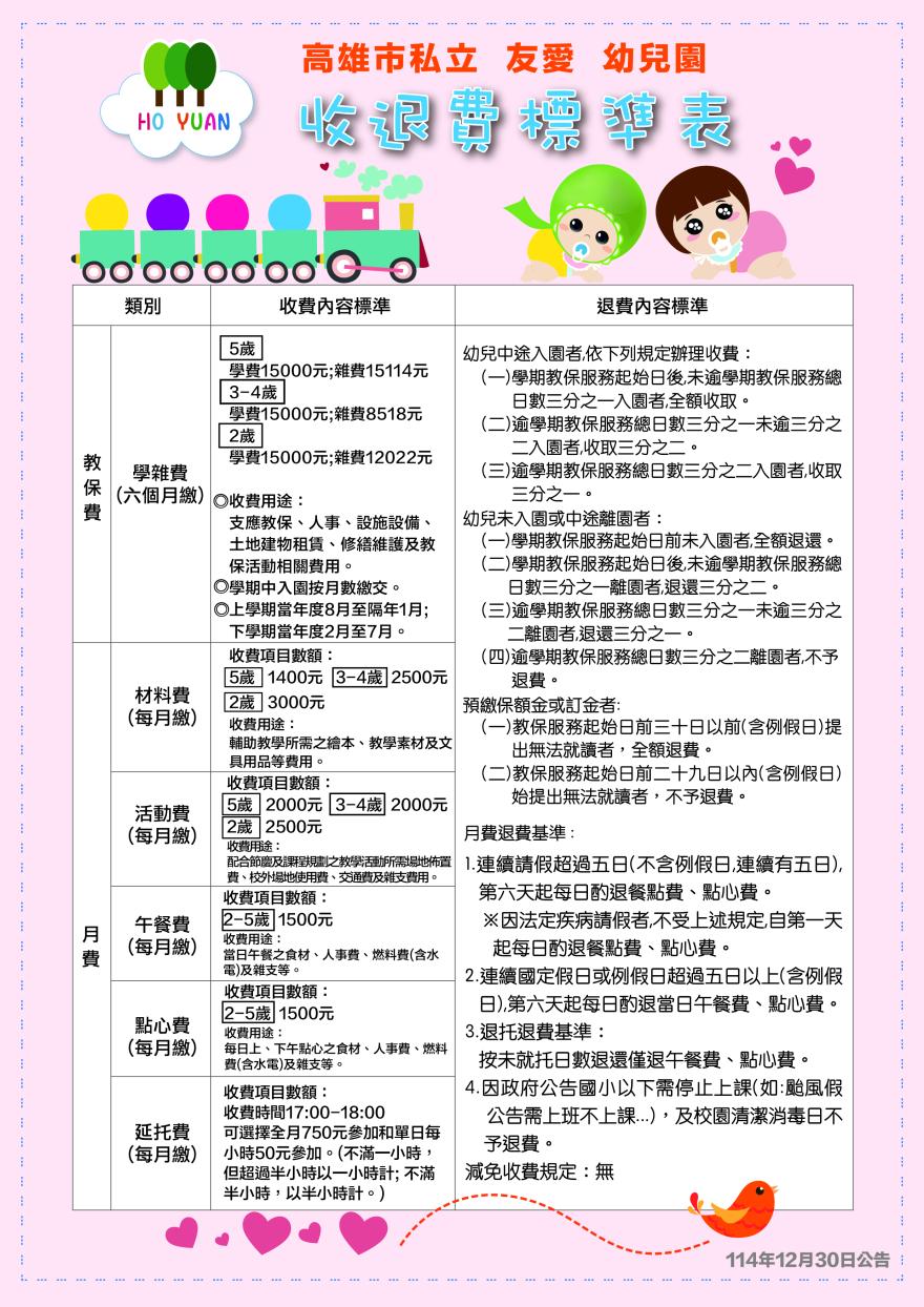 高雄市私立友愛幼兒園114學年度收退費標準表
