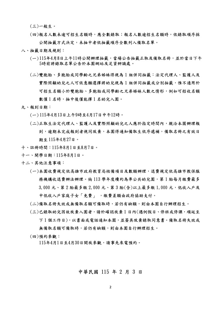 高雄市私立禾園幼兒園115學年度新生入學招生簡章
