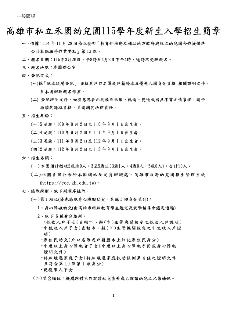 高雄市私立禾園幼兒園115學年度新生入學招生簡章
