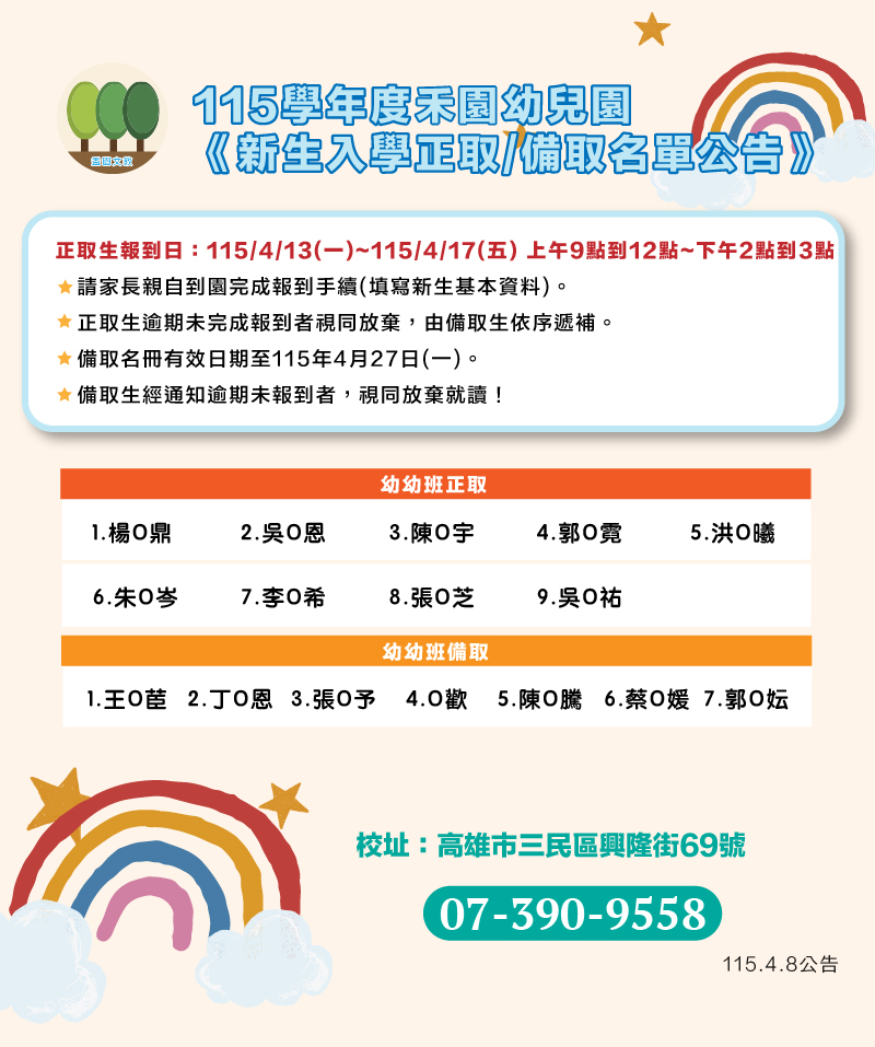 115學年度禾園幼兒園新生錄取名單 2026-04-08    總部消息